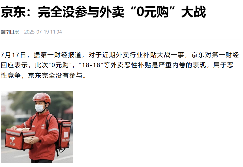 而京东方面于7月17日对媒体示意,此次“0元购”,“18-18”等外卖恶性补贴是严重内卷的施展,属于恶性竞争,京东完全莫得参与。