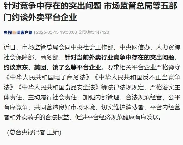 5月13日,市集监管总局会同中央社会责任部、中央网信办、东说念主力资源社会保障部、商务部,勾搭约谈京东、好意思团、饿了么这三大外卖平台企业。