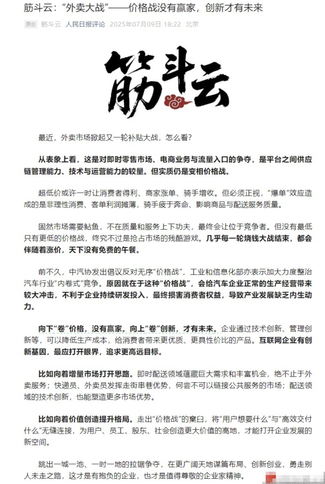 7月9日,东说念主民日报发布驳倒著作《筋斗云:“外卖大战”——价钱战莫得赢家,立异才有翌日》,把话仍是说的很袒露了,明确指出这一轮的补贴大战骨子上就是变相价钱战,不利于平台不利于商家以致不利于花消者,东说念主民日报但愿这些企业不要向下“卷”价钱,要进取“卷”立异,要立异创业勇走别东说念主未走之路。