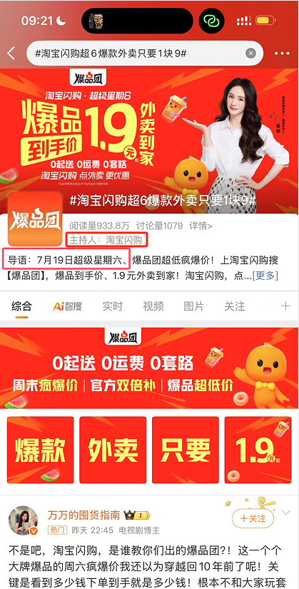 7月19日,约谈后的第二天,淘宝依然在大批发外卖补贴,以致还我方主握了个#淘宝闪购超6款外卖只须1块9#的行为,然后我方把我方弄成了微博热搜。
