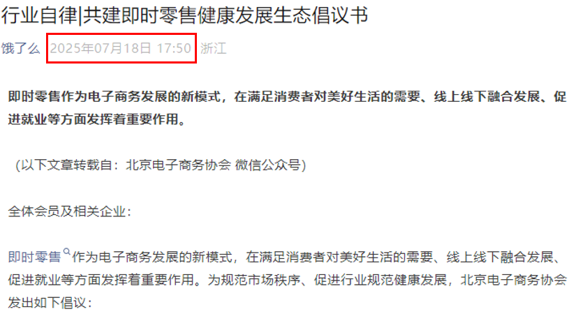 7月18日下昼约6点,淘宝、饿了么差别转发了北京电子商务协会本日早间发布的《共建即时零卖健康发展生态倡议书》,算作公开表态。