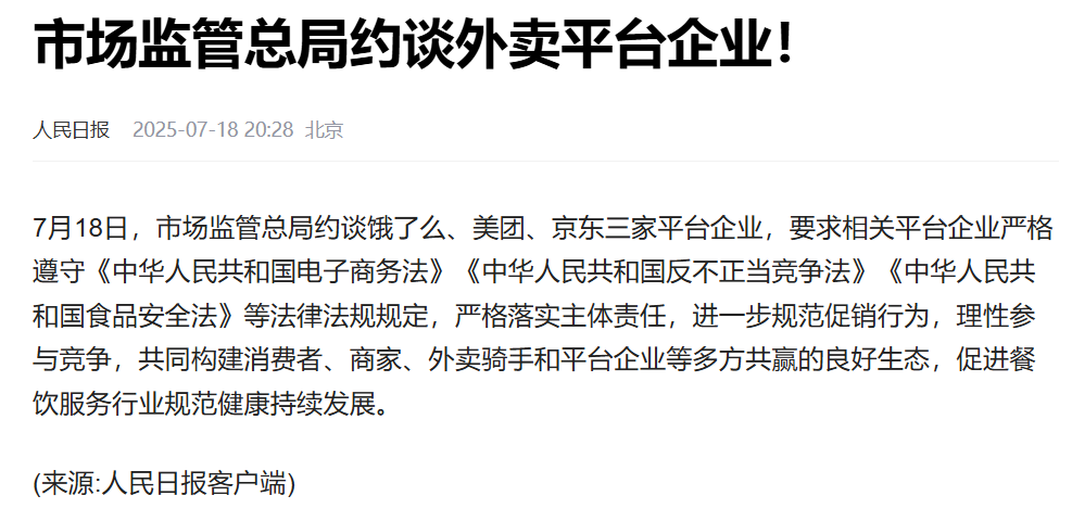 7月18日,市集监管总局再次约谈三大外卖平台企业,不外此次约谈的是饿了么、好意思团、京东这三家企业。