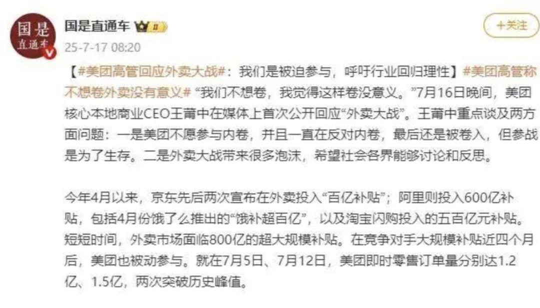 7月16昼夜间,好意思团高管公开表态,称好意思团不念念卷,认为这样卷没道理,一直在反对内卷,临了照旧被卷入,参战是为了糊口,但愿行业总结感性。