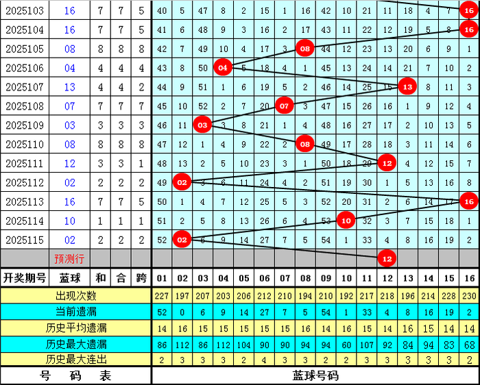 在最近10期开奖中,该区蓝球出现了3次,蓝球号码出现比例较低,近期谨慎该区蓝球回补。
