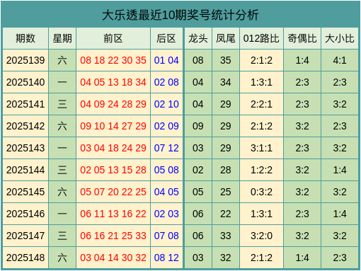 上期回归:大乐透第2025148期:前区03、04、14、30、32;后区08、12,其中前区012路比为2:1:2,奇偶比为1:4,后区开出偶数号码08、12。